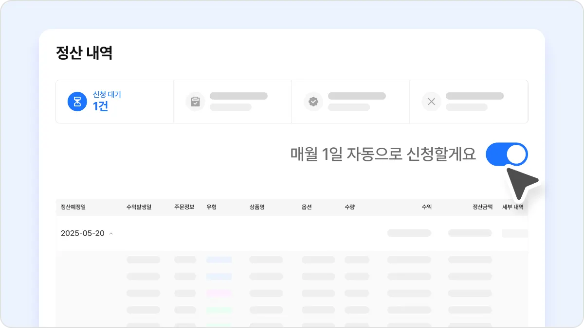 매달 자동으로 정산받길 희망한다면? '자동 정산 신청' 토글을 켜주세요.