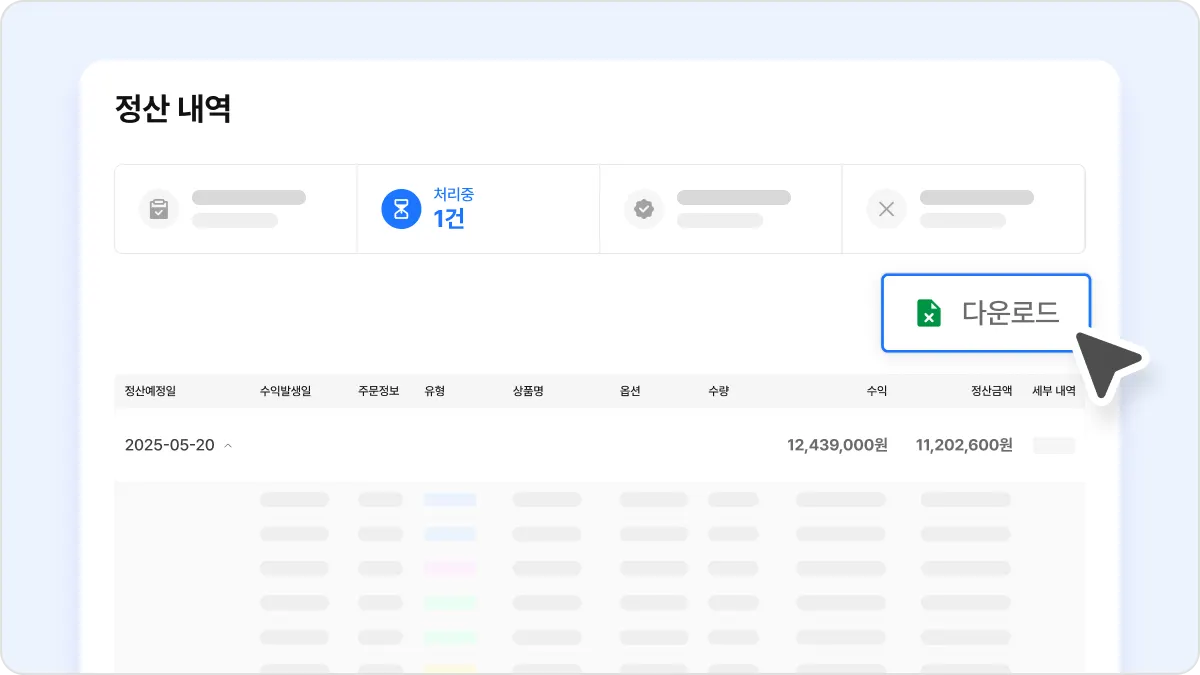 이제 내가 정산받는 금액이 어떤 주문들을 모아서 계산된 것인지 한눈에 확인할 수 있습니다. 예를 들어, 약 11,200,000원을 정산받는다고 가정한다면, 이 금액이 언제, 어떤 상품의 판매 내역으로부터 계산된 것인지 확인할 수 있습니다.