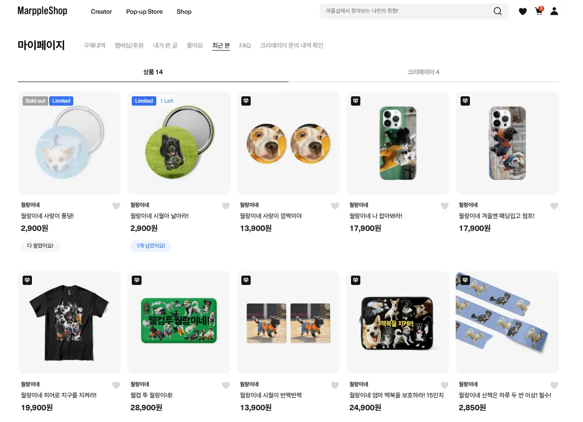 마플샵에 로그인한 후, 마이페이지에서 ‘최근 본’ 탭을 선택하면 최근 본 상품과 크리에이터를 확인하실 수 있어요.