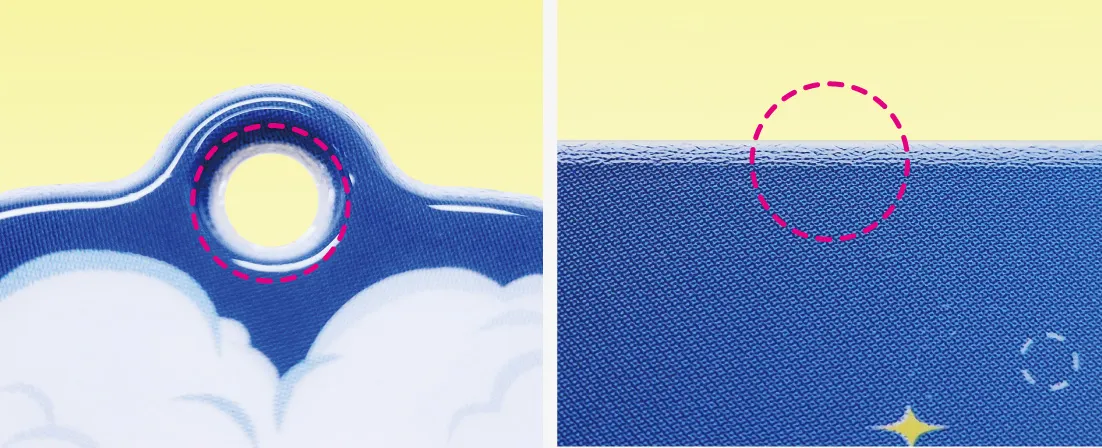 PVC 원단에는 작은 점이나 미세한 얼룩이 있을 수 있습니다. 투명 원단 뒷면으로 인쇄하기 때문에 밝은 색상으로 인쇄 시 이러한 얼룩이나 점이 더 잘 보일 수 있습니다. 이에 따른 교환 및 환불은 불가하니 양해 부탁드립니다.