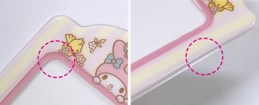 고열로 누르는 과정에서 바깥 부분과 창 안쪽 인쇄가 깨지거나 쪼개질 수 있으며, 진한 색상일수록 더 두드러집니다.