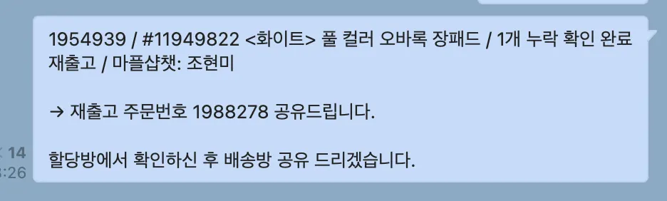 [할당방]에서 확인, 재제작(재출고) 주문서에 할당 완료되면 [마플샵&해외 배송방]에 공유