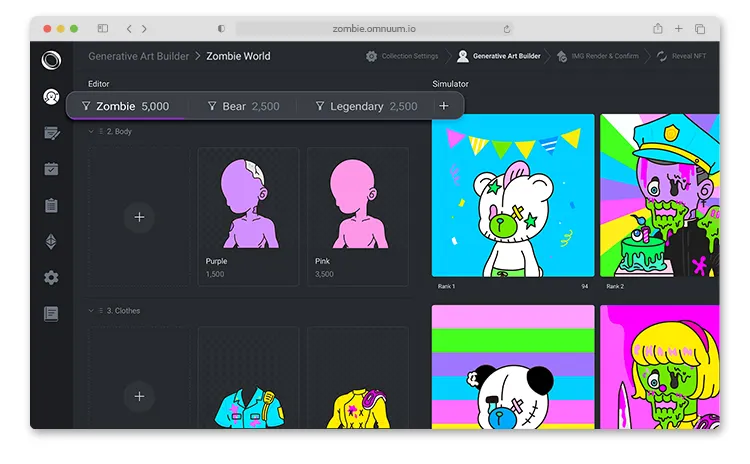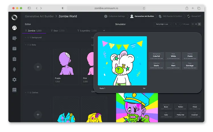 모든 파츠를 올리고 에디터 왼쪽 하단의 Generate 버튼을 눌러줍니다. 제너레이티브 아트 빌더가 파츠를 렌더링해 왼쪽 Simulator에 PFP를 조합합니다. 이때 Simulator에 보이는 이미지는 저용량으로 빠르게 렌더링하는 이미지로, HD Render and Upload 렌더링과 품질의 차이가 있습니다. 파츠들이 올바른 위치와 순서로 합성됐는지 확인합니다. 렌더링이 잘못됐을 경우나 마음에 들지 않을 때는 다시 조합합니다.