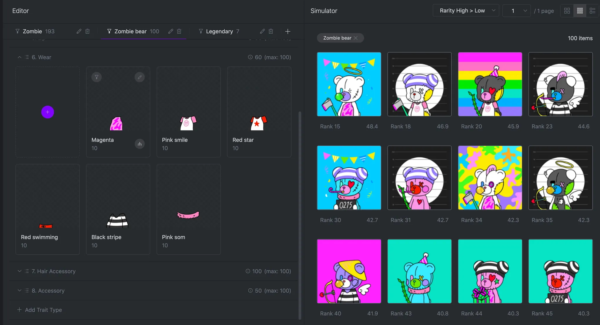 좀비 베어의 테마의 PFP 총 수량이 100개일 때, Wear(옷) 타입의 합이 60개라면, Zombie bear는 60%의 확률로 옷을 입습니다. 어떤 Zombie bear는 옷을 입고, 어떤 Zombie bear는 옷을 벗고 나옵니다. 옷이 아니라, 머리, 액세서리, 도구 등 다양한 타입에 적용할 수 있습니다.