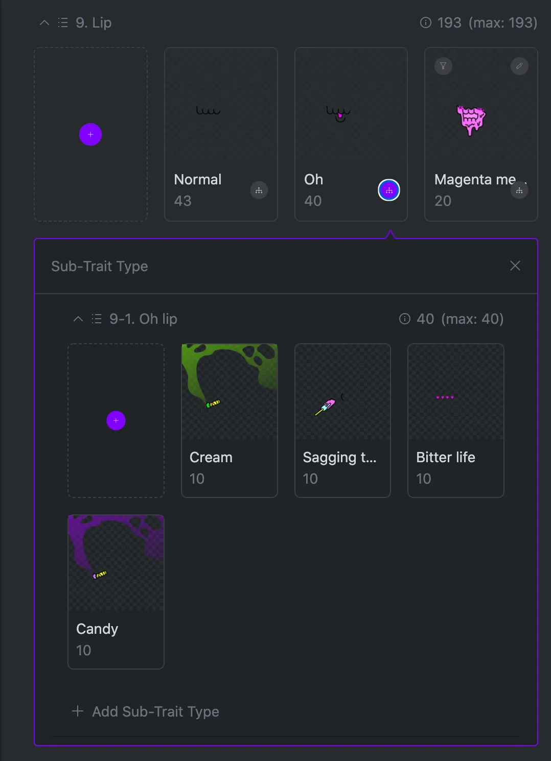 서브 트레이트는 특정 아이템에만 나오는 액세서리나 물건을 추가하고 싶을 때 사용하는 기능입니다. 예를 들어 ‘벌어진 입 모양’이 나올 때만 아이스크림, 막대사탕 등이 나오게 하고 싶다면 Sub-Trait Type 을 추가합니다.