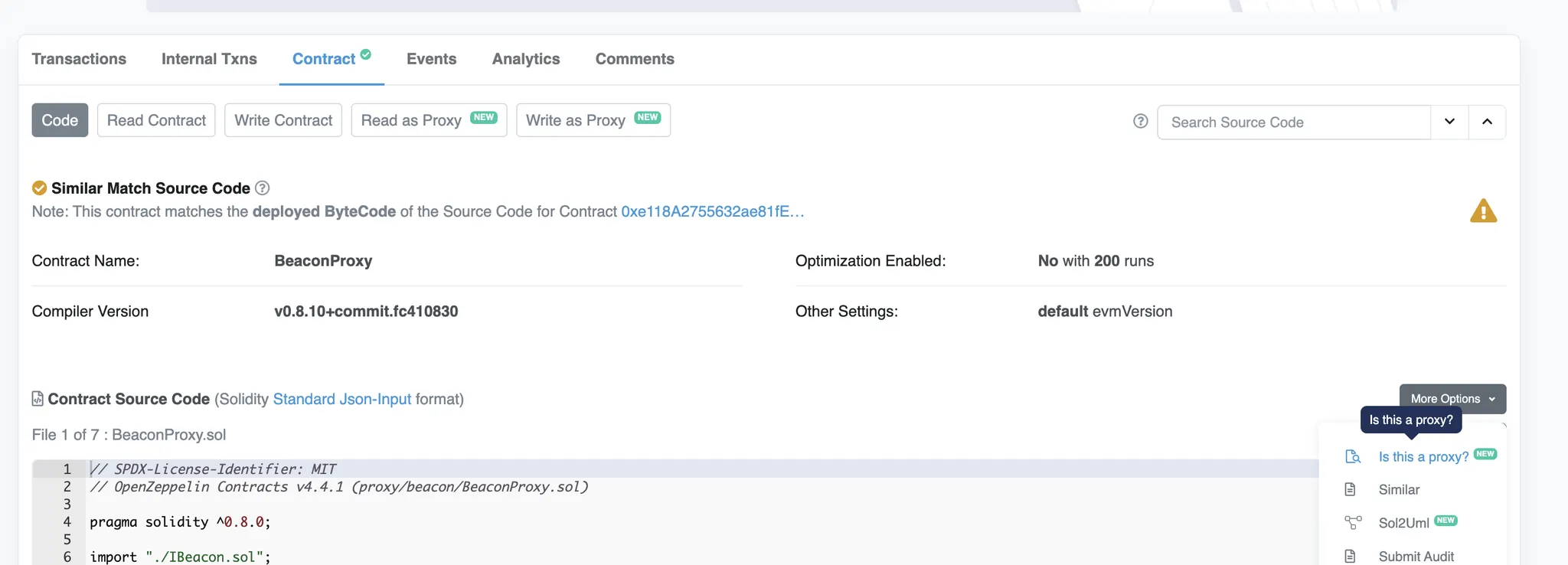 아래와 같이 Contract 메뉴에서 우측에 “More Options” > Is this a proxy 를 눌려 주세요.
