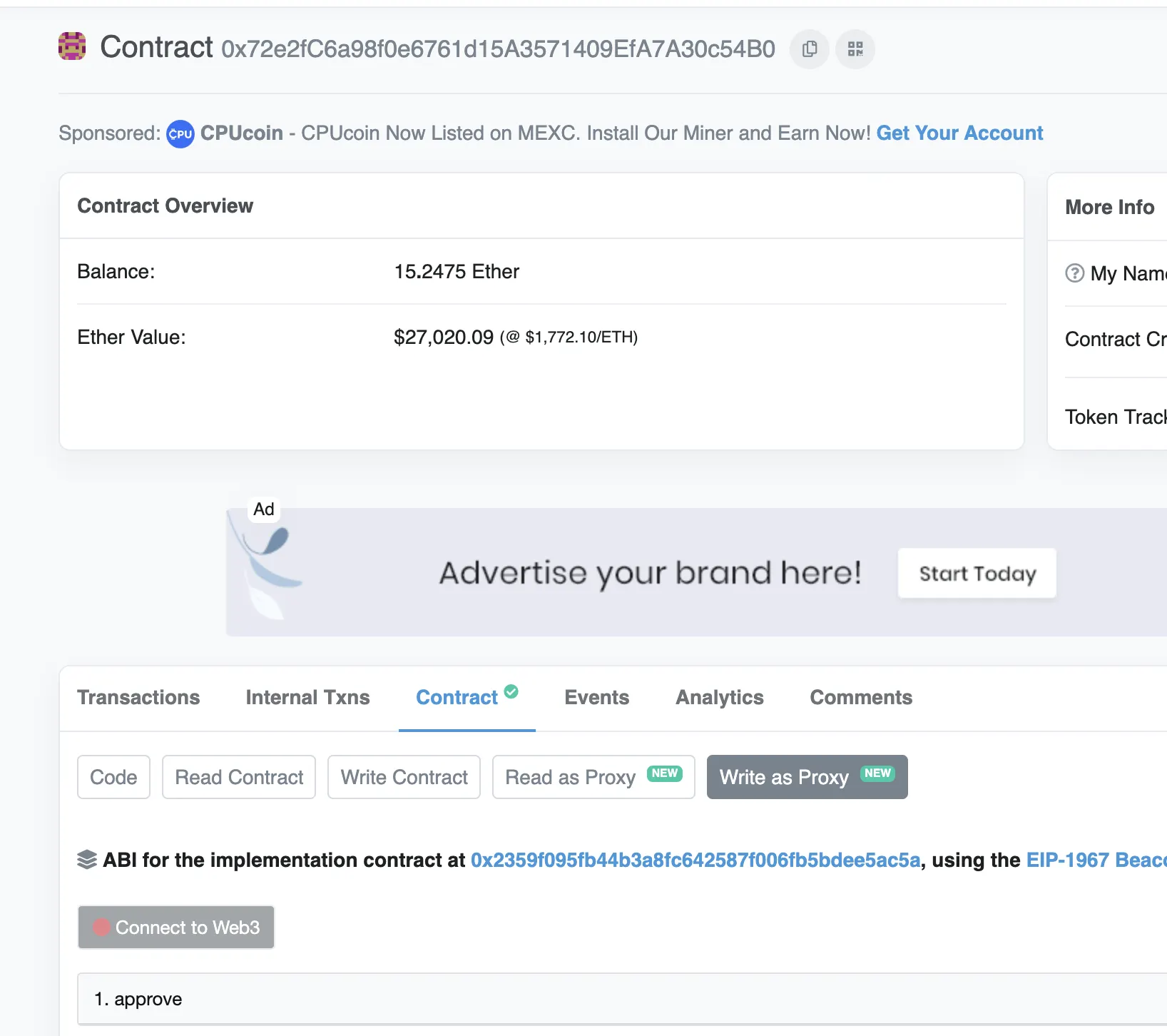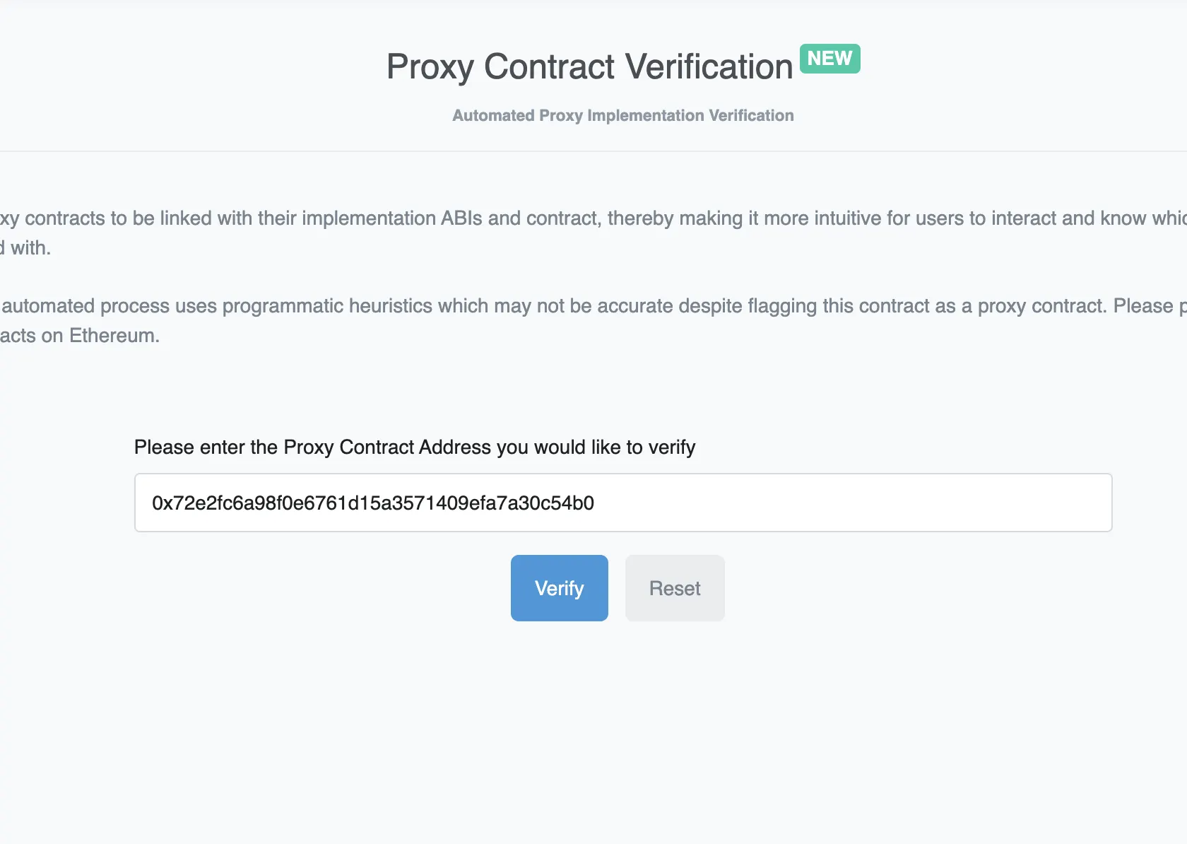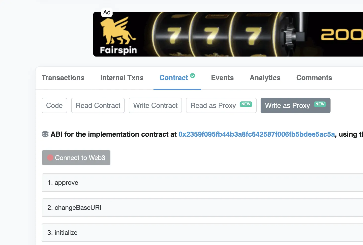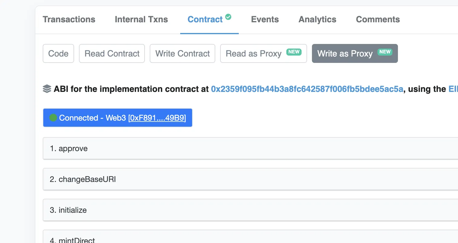 Proxy Contract Verification 페이지에서 자동으로 들어가 있는 주소에 대해 “Verify” 를 눌려 주시면 그 다음부터는 Write as Proxy 메뉴가 보이게 될 거에요. (가스비가 드는 건 아니니 자유롭게 해주세요)