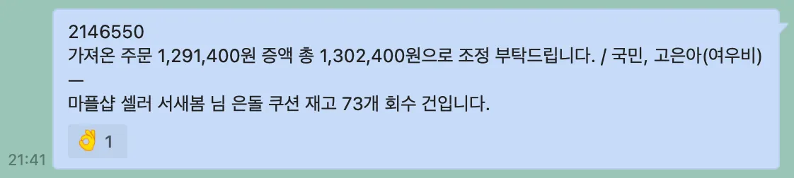 예시: 가져온 주문 1,291,400원 증액 총 1,302,400원으로 조정 부탁드립니다. / 국민, 고은아(여우비)
