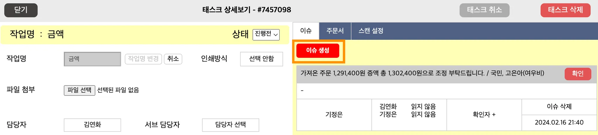 만약 이미 완료된 [금액] 태스크가 있어 생성되지 않을 경우, 원래 있는 금액 태스크 상태 ‘진행 중’으로 변경