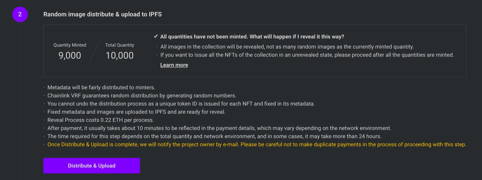 민팅이 100% 되지 않은 경우에 리빌을 하게 되면 민팅된 9,000개만 리빌 되는 것이 아닌, 10,000개가 모두 리빌됩니다.