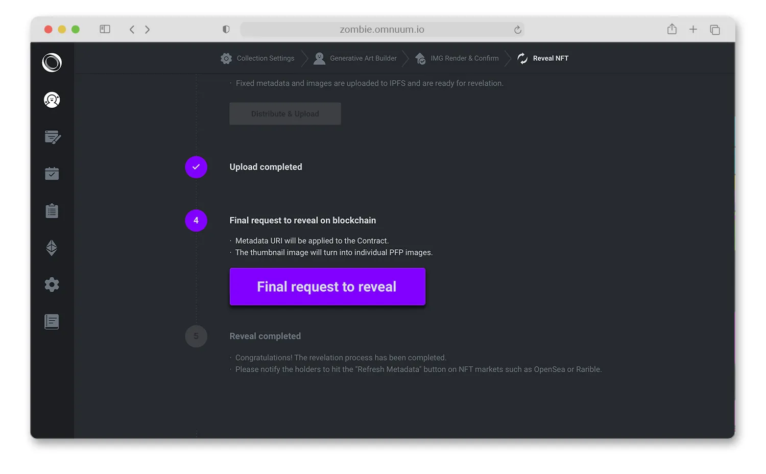 모두에게 공정한 방식으로 NFT가 배분될 수 있게 컬렉션 총 수량 모두 100% 민팅이 완료된 상태에서 리빌을 권장합니다.