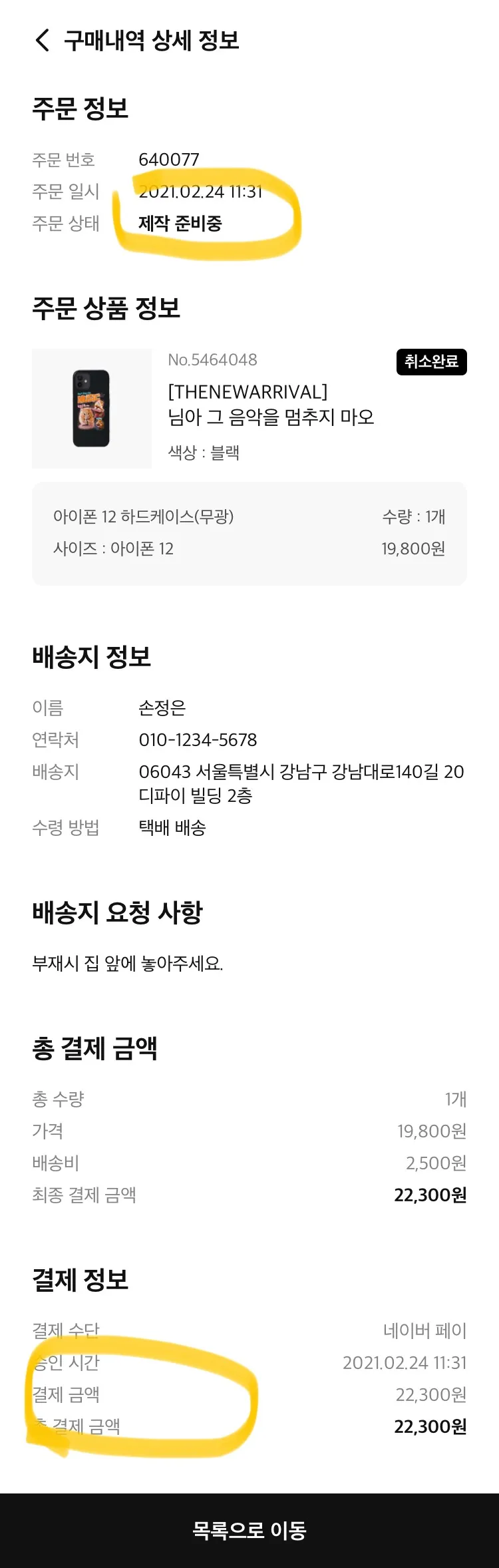 주문취소 완료의 경우 결제 내역에 결제취소/환불완료 내역도 확인이 되어야 할 것 같습니다.