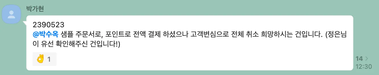 카카오워크 > 금액조정방 > 박수옥 차장님 태그, 주문번호와 함께 내용 전달