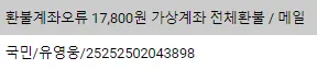 가상계좌 환불일 경우 반드시 환불 받을 계좌번호, 은행, 이름 결제정보 가장 하단 ‘결재 내역 - 환불 카드’란에 에 기재 필요