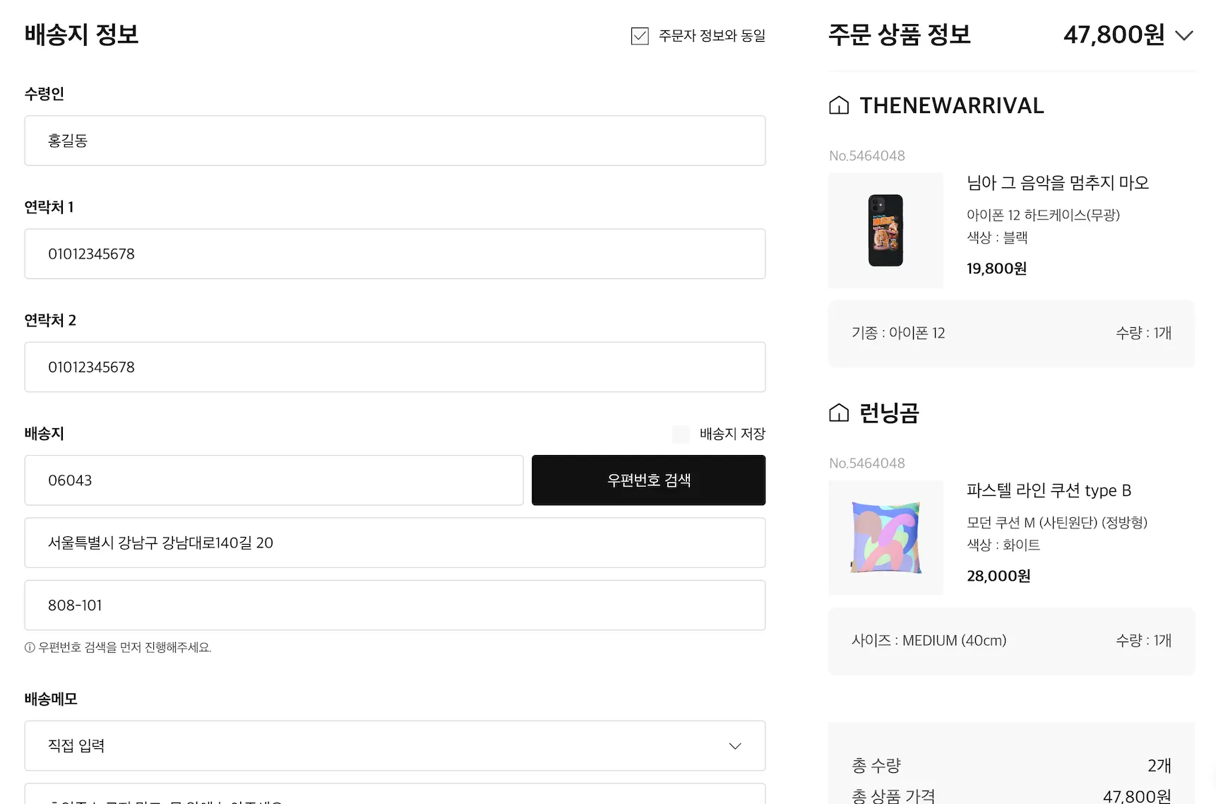 왼쪽 배송지정보가 중요한 페이지 인건 맞는데 사실 생각보다 이름/연락처/주소의 데이터 내용이 길지 않고