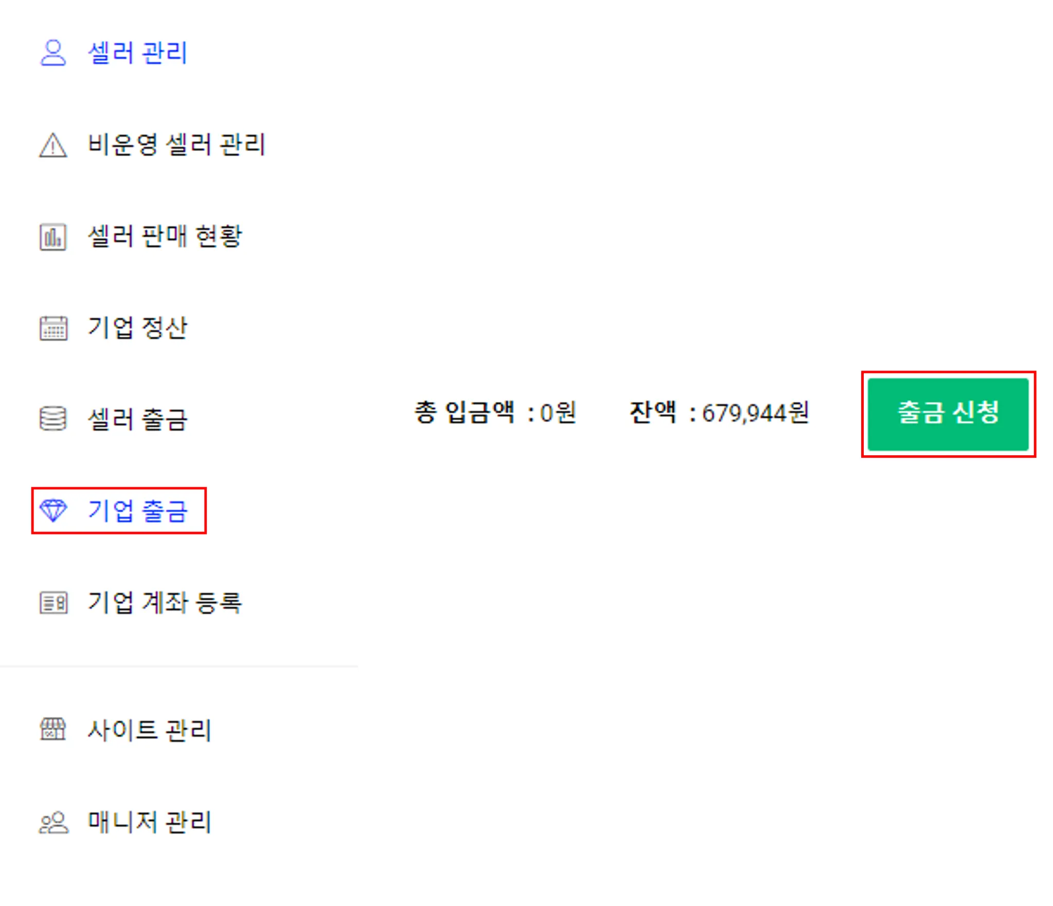 매달 1일~10일 사이에 플러스 어드민 ‘기업 출금→출금 신청’ 클릭