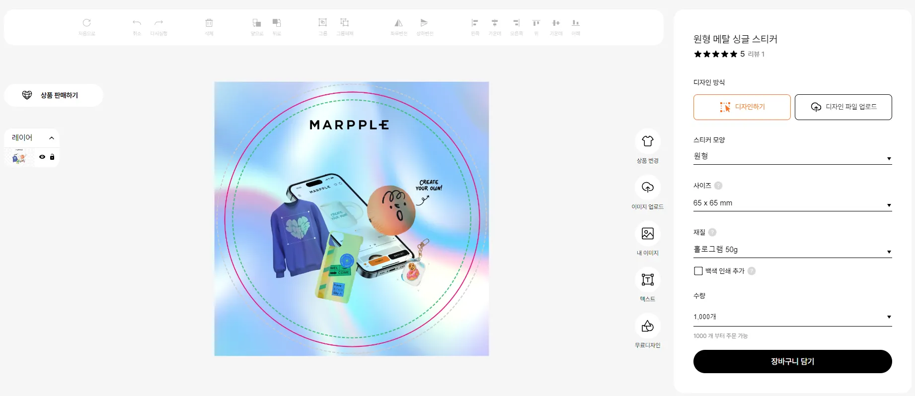 싱글 스티커 [디자인하기] 버튼을 선택하면 만들기 툴을 통해 쉽고 빠르게 스티커를 만들 수 있어요.