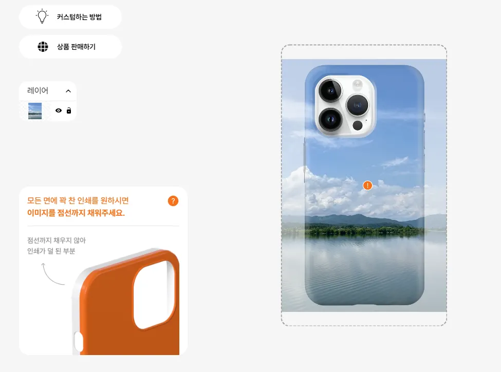디자인이 점선 가이드라인 내에 충분히 채워지지 않았을 경우 이미지 경고 아이콘과 제작 주의 안내 문구가 노출되어 주문 전에 디자인 오류를 바로 확인하실 수 있어요.
