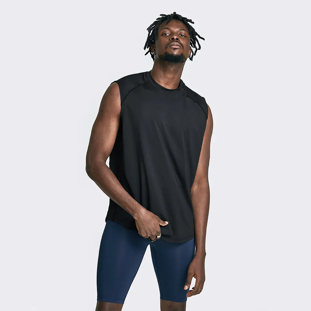 A sleeveless T-shirt made with a four-sided span that has excellent elasticity.